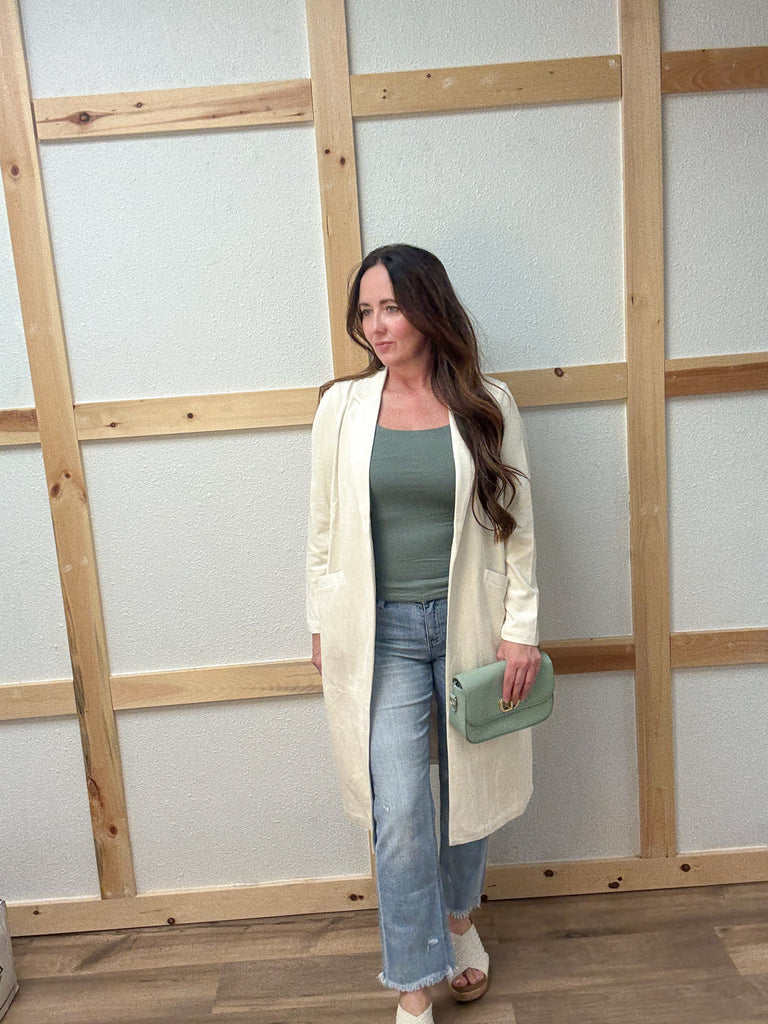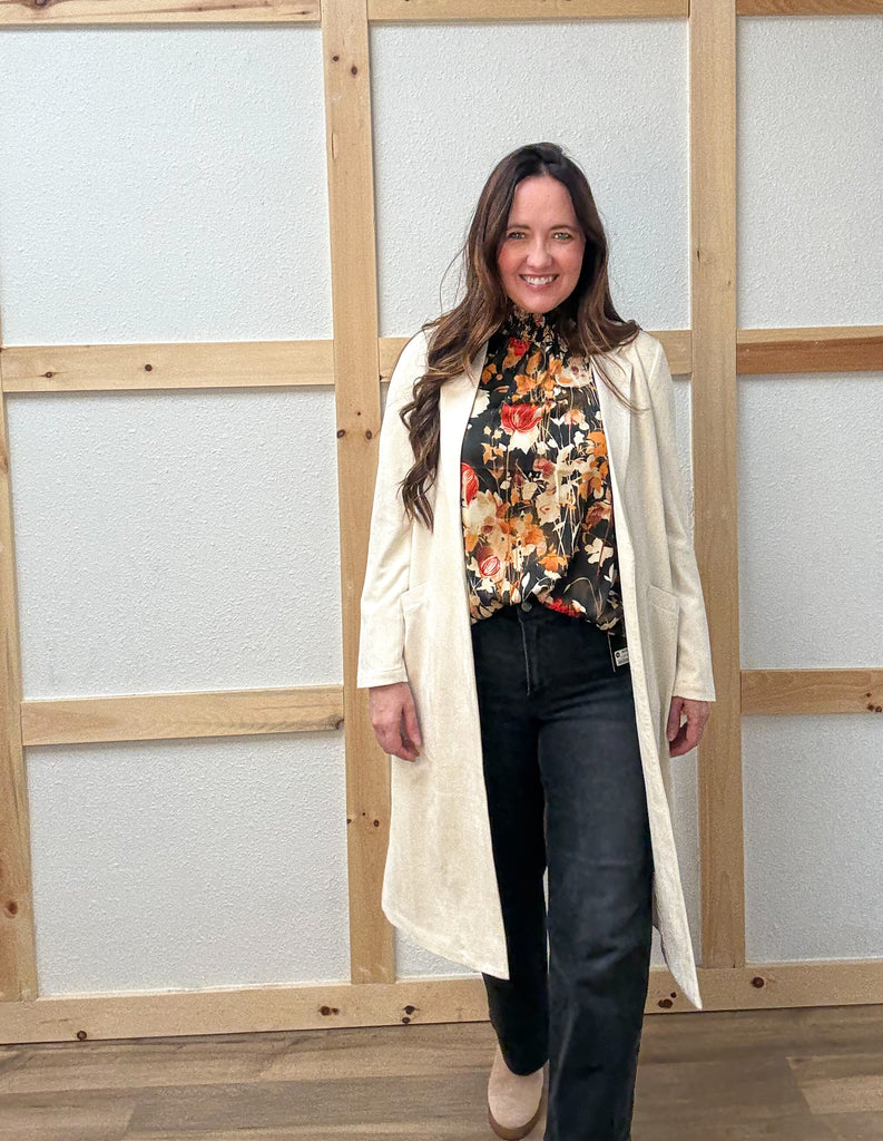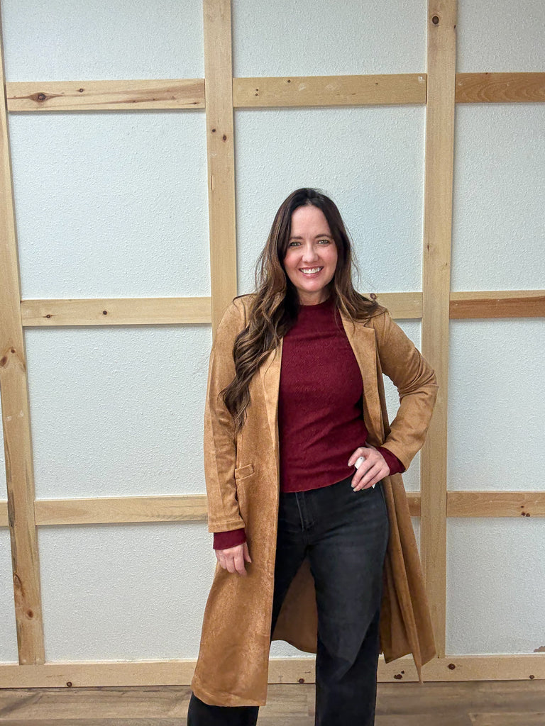 This Faux Suede is perfect for fall! Rachel is wearing a small. 92% Polyester 8% Spandex