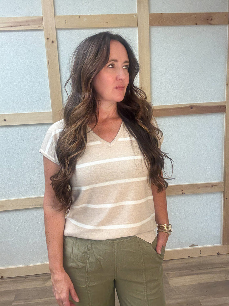 Crazy soft v-neck sleeveless top. Rachel is wearing a medium. 60% Polyester 20% Acrylic 20% Nylon