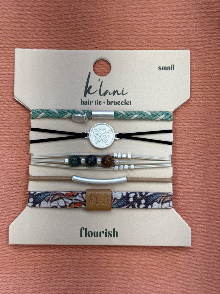 Don't ever be without a hair tie again! We are in LOVE with these hair tie sets that look like bracelets! Looks stylish, but oh so functional... each one is a hair tie. Medium is like a normal hair tie width and fits wrists that are 5-6.4". Small fits wrists that are smaller than 5". Large fits 6.5"-7.5" wrists.