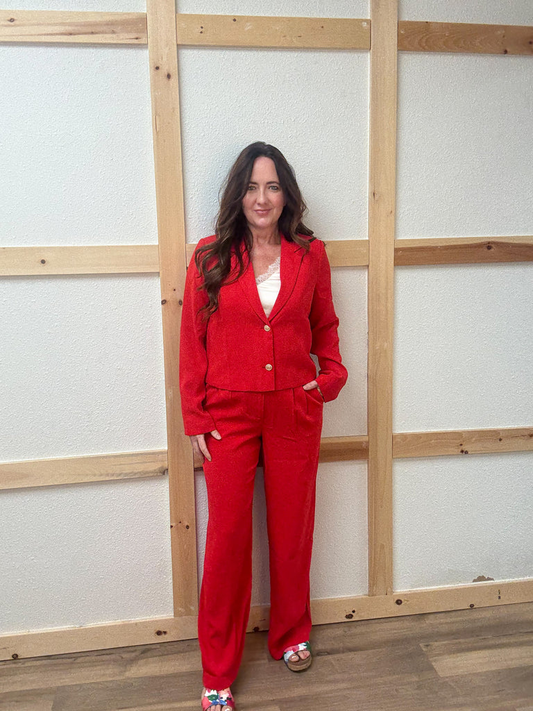 High waisted wide leg trouser pant. Rachel is wearing a medium. 97% Polyester 3% Spandex
