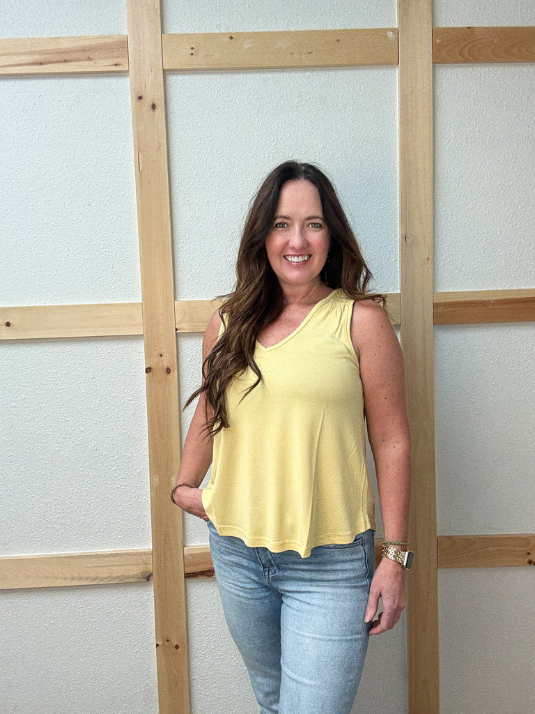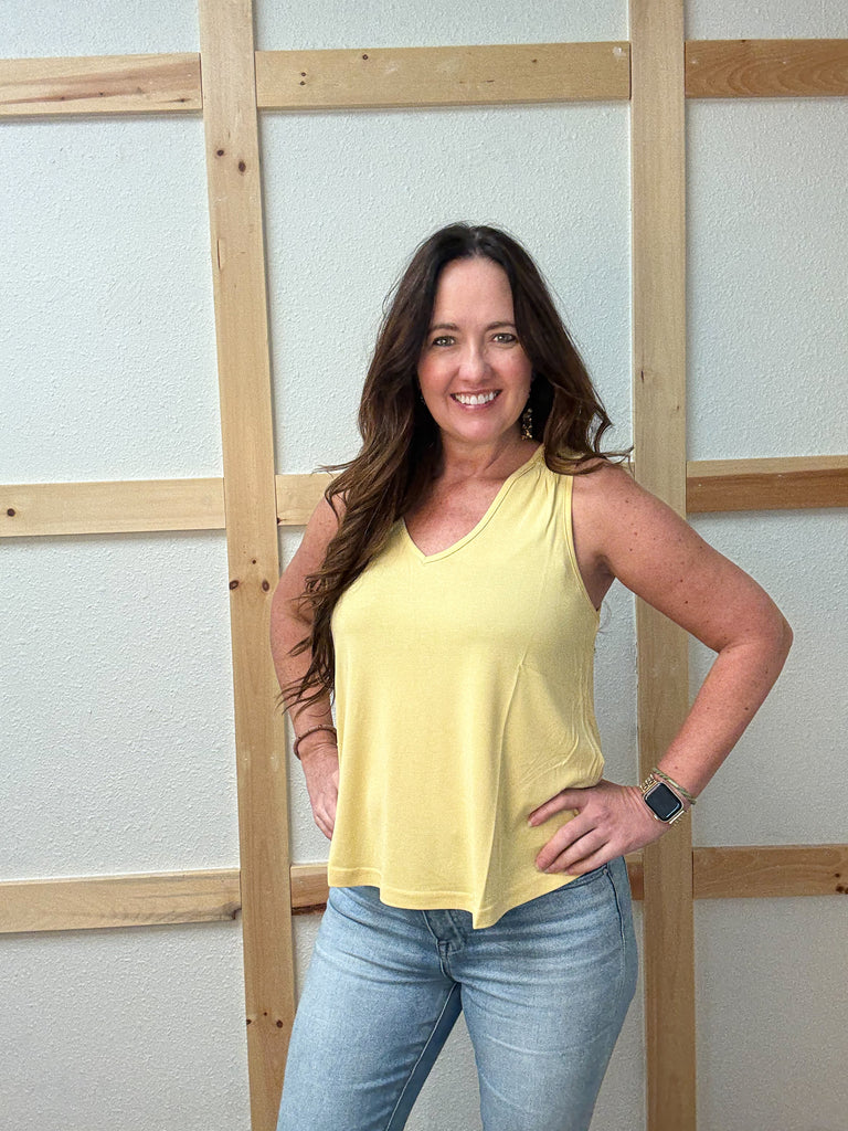 Love this color for SUMMER! Great by itself or as a layer on a cooler day. Runs true to size. Rachel is wearing a small. 70% Modal 30% Polyester