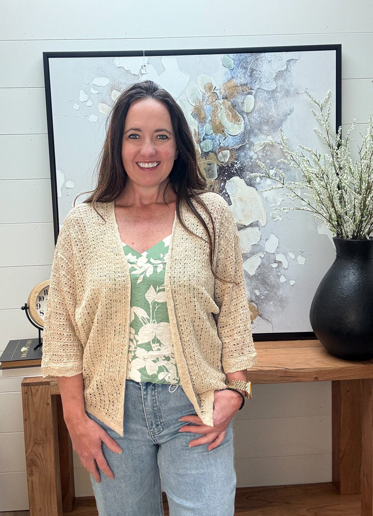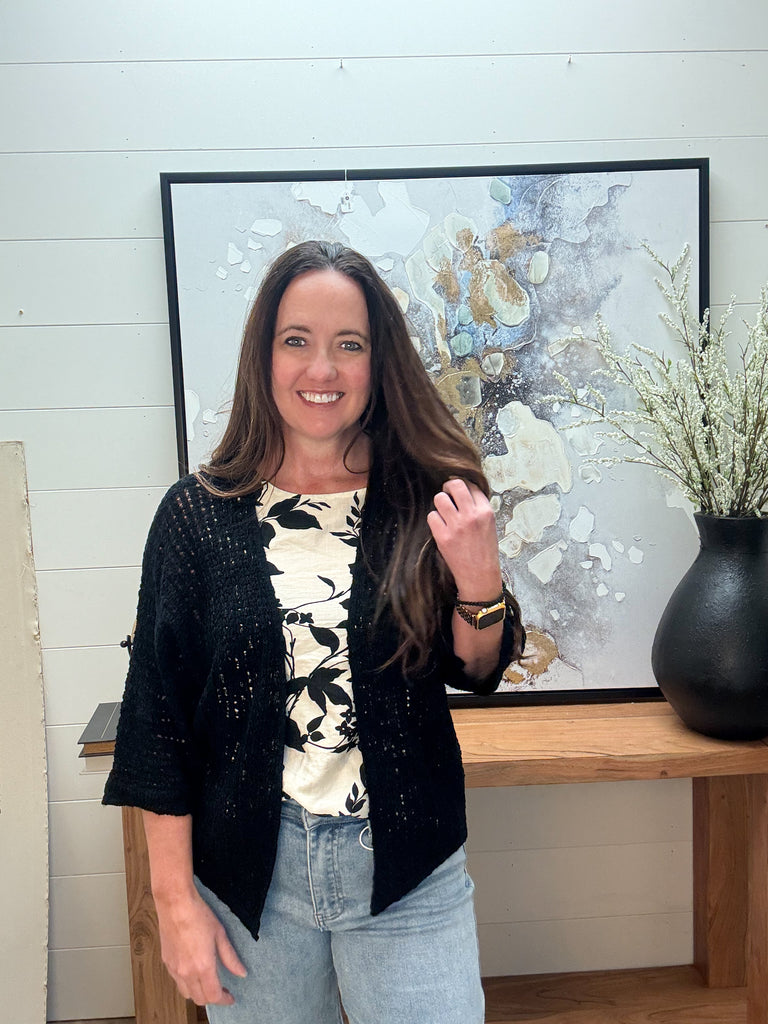 Available in natural or black, this kimono style cardigan is a fabulous staple in your closet. The open crochet knit makes it a fabulous layer for tanks, dresses & short sleeved tops! Runs true to size. Rachel is wearing a small. 100% Acrylic