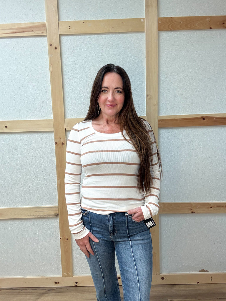 Super soft long sleeve tee is great for cooler summer days & nights! Runs a little small. Rachel is wearing a medium. 96% Rayon 4% Spandex