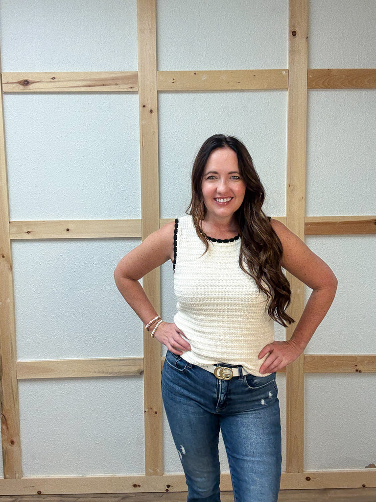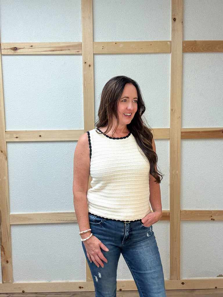 Ivory sweater tank with contrast black edging at neckline, hemline & sleeve openings. Rachel is wearing a medium. 100% Cotton